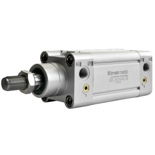 Cilindro neumático Serie SE – Cumple con la norma ISO 15552. Diseño sin vástago con junta universal, tubo de aluminio cuadrado sin tirante para mayor resistencia a la corrosión y amortiguación ajustable en ambos extremos. Compatible con interruptores magnéticos y disponible en diámetros de 32 a 125 mm.